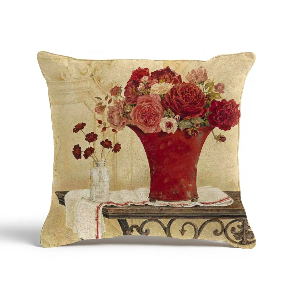 Flora: Klasik Sanatın Dokusu – Sanatsal Baskılı Kırlent. Zamanın durduğu bir kış bahçesinin canlılığını ve klasik sanatın asaletini yaşam alanınıza bu özel tasarımla taşıyın. Üstelik Flora, canlı kırmızı güllerin ve zarif çiçeklerin bir vazoda sergilenen o muazzam kompozisyonunu yumuşak bir dokuyla buluşturuyor. Mekanınıza sadece konfor değil adeta çerçevelenmemiş bir tablo zarafeti katan bu tasarım dekorasyonunuzun ruhunu bir anda tazeleyecek sanatsal bir dokunuştur. Sonuç olarak bu kırlent hem görsel bir şölen sunar hem de dinlenme alanlarınızda ihtiyaç duyduğunuz sıcak atmosferi kusursuzca yaratır. Özellikle klasik desenleri sevenler için Flora, ev tekstilinde sofistike bir imza niteliği taşır.
